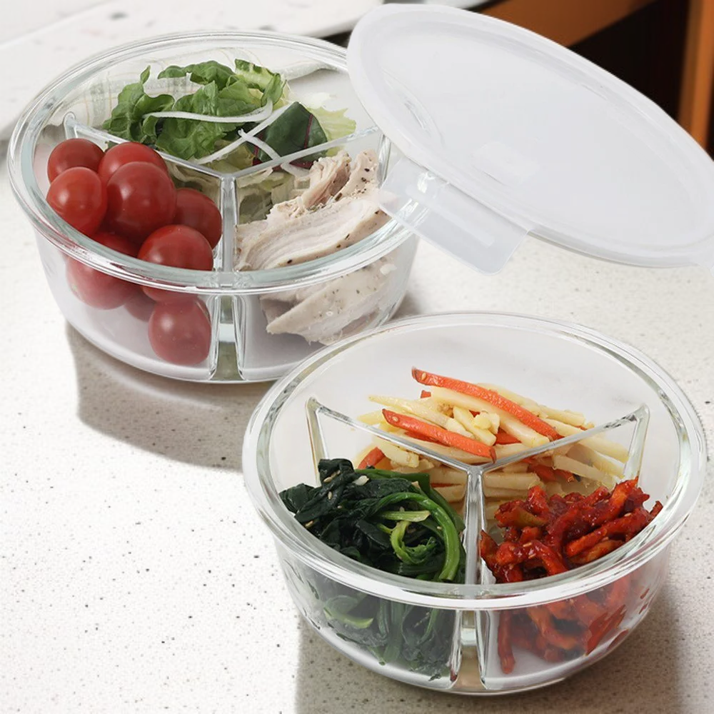 حاوية مقسمة للطعام من الزجاج المقاوم للحرارة (دائرية، 3 أقسام، 2 قطعة)