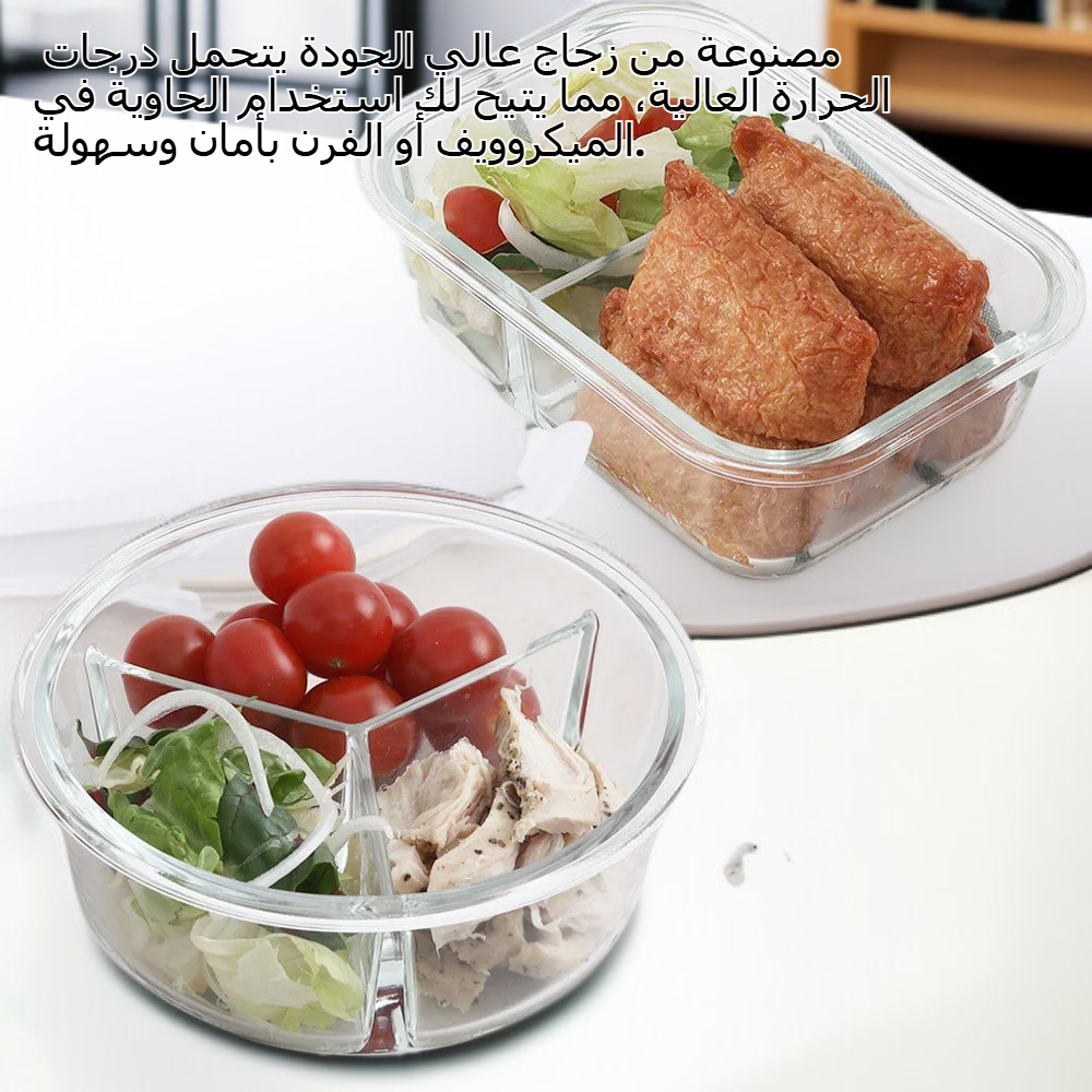 صندوق غداء مشترك من الزجاج المقاوم للحرارة 1+1 محكم الإغلاق، مكون من 3 أقسام، مستدير، 2 قطعة