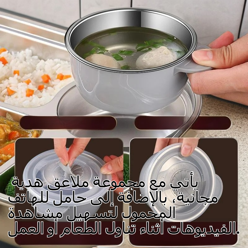 ● مجموعة عصرية تشمل وعاء طعام من الستانلس ستيل مع حقيبة عزل حراري، توفر لك الحفاظ على حرارة الطعام لفترات طويلة أثناء تنقلاتك اليومية. ● يأتي مع مجموعة ملاعق هدية مجانية، بالإضافة إلى حامل للهاتف المحمول لتسهيل مشاهدة الفيديوهات أثناء تناول الطعام أو العمل. ● سعة كبيرة 1.5 لتر و2 لتر تناسب جميع احتياجاتك، كما أن المنتج آمن للاستخدام في الميكروويف لسهولة تسخين الطعام في أي وقت. ● تصميم عملي ومتين يضمن مقاومة الصدمات والتسرب، مناسب للطلاب، الموظفين، والرحلات الخارجية.