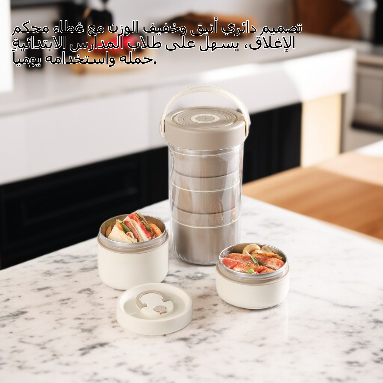 ● مصنوع من الفولاذ المقاوم للصدأ عالي الجودة، يوفر حماية مثالية للطعام ويحافظ على نكهته طازجة وصحية طوال اليوم. ● تصميم دائري أنيق وخفيف الوزن مع غطاء محكم الإغلاق، يسهل على طلاب المدارس الابتدائية حمله واستخدامه يومياً. ● يتميز بقدرة فائقة على الحفاظ على حرارة الحساء أو الطعام لفترات طويلة، ما يجعله مثالياً للوجبات المنزلية الدافئة في أي مكان وزمان. ● سهل التنظيف ومتين، مقاوم للخدوش والتآكل، ما يضمن استخداماً آمناً وطويلاً للأطفال أثناء الذهاب إلى المدرسة أو الرحلات. ● مناسب لتخزين أنواع مختلفة من الأطعمة والسوائل، مع ضمان عدم تسرب الروائح أو السوائل بفضل نظام الإغلاق المتطور.